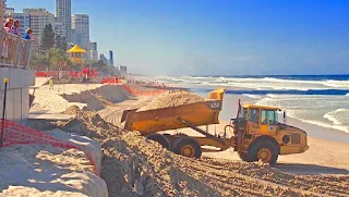 Heavy Machinery Repairs the Damage on Surfers Paradise Beach. Surfers Paradise Beach was Hit by Harsh Wet Season in 2013 with King Tides Smashing the Coastline. This Event happens normally every 6-10 Years, The Council needs to repair the Tourist Beachers because mother nature takes about 12 months to replace the sand.